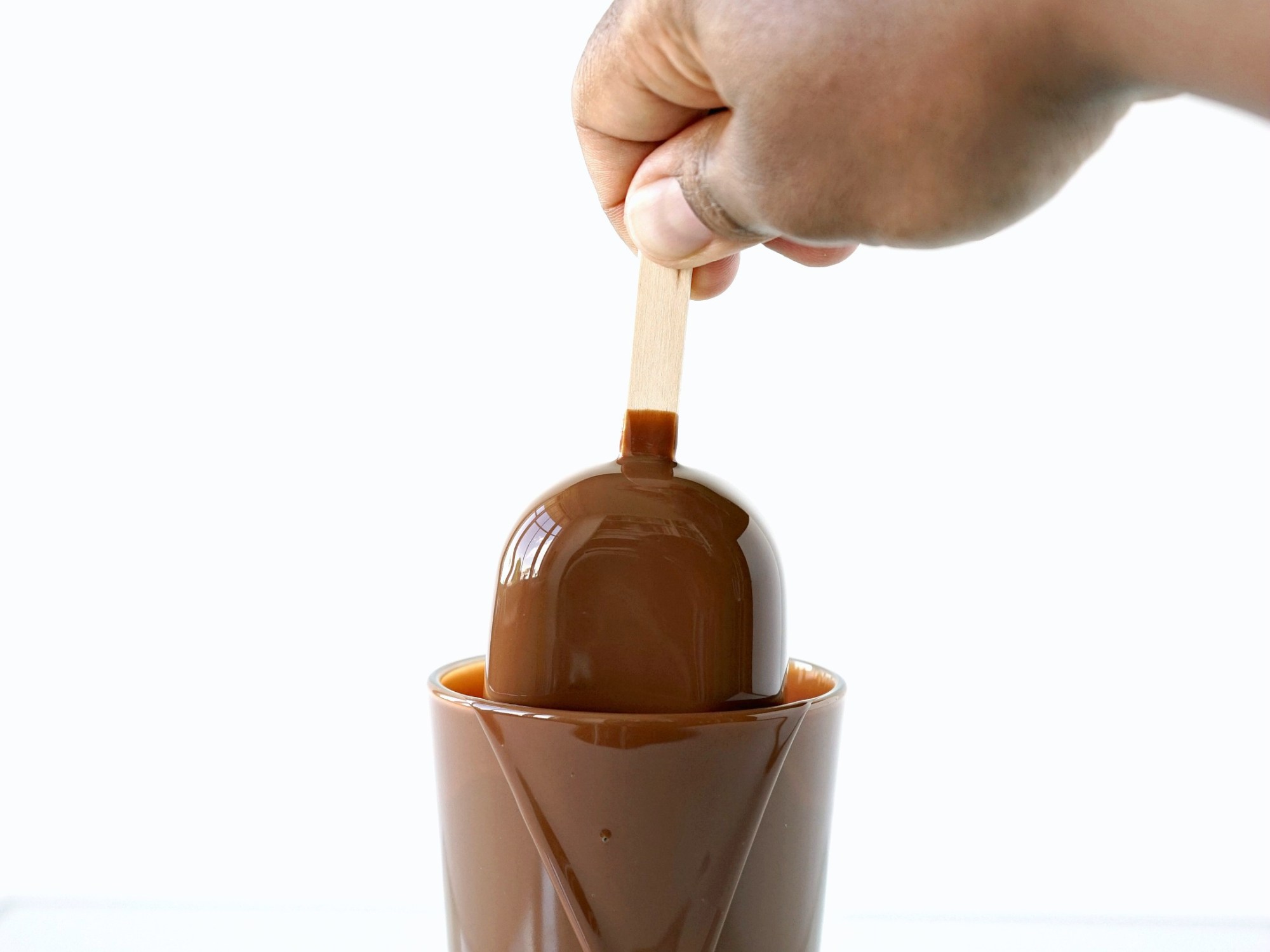 Para revestir os picolés, eu enchi um copo de vidro alto com o chocolate diluído e mergulhei cada picolé nele. Esperei cerca de 4 a 5 segundos e retirei.